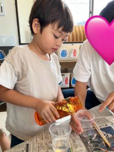 透明なコップに、きれいな色水をそっと注いで——じーっと見つめたり、そーっと重ねたり…どの瞬間も、こどもたちのまなざしは真剣そのもの👀✨ この日は「色水あそび」にチャレンジ!🧪 カップに少しずつ水を注いで、色の変化を楽しん […]