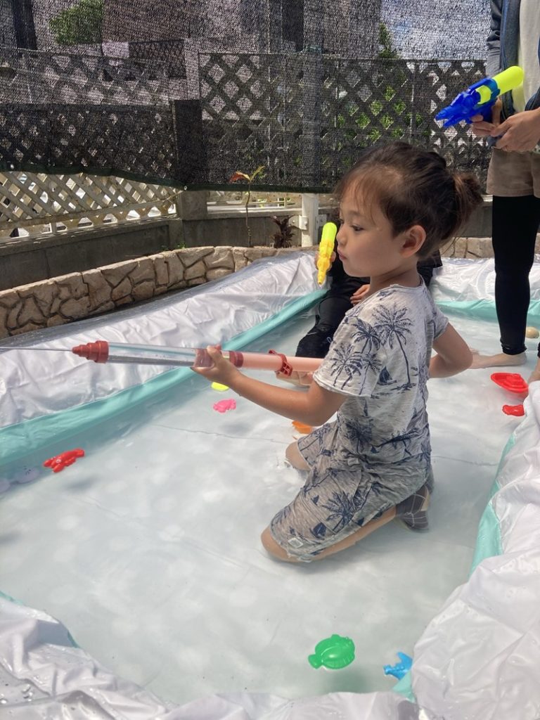 おもちゃの水鉄砲やシャワー遊びで、