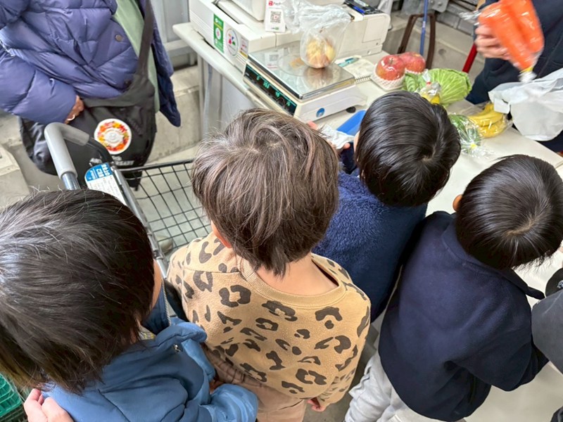 野菜や果物を自分で選び、かごに入れて、レジでお会計まで体験しました🍓🥕🥬