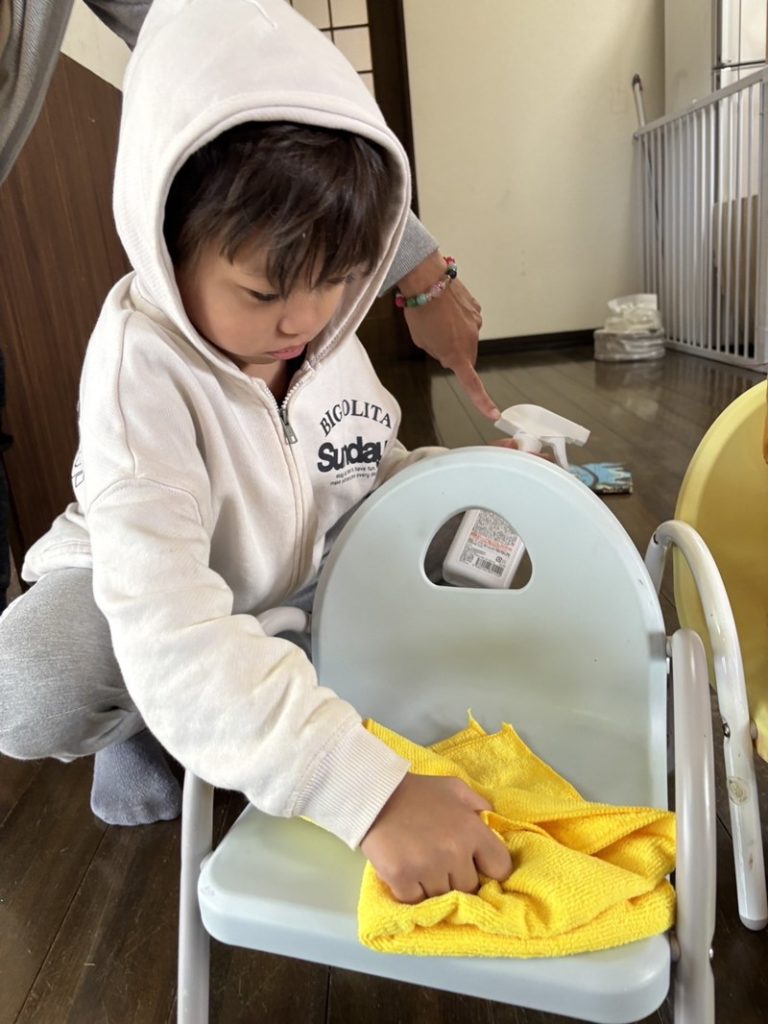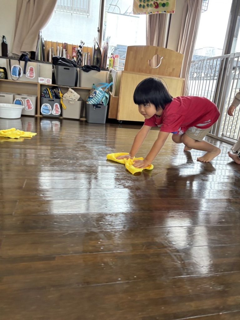 雑巾を持って床を拭いたり、椅子をきれいにしたり。