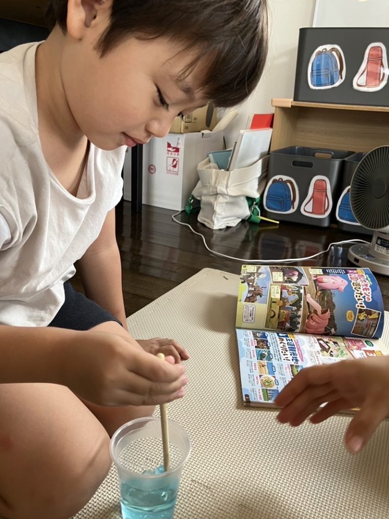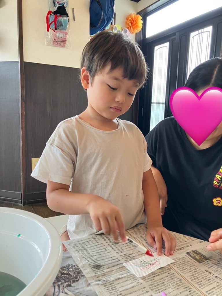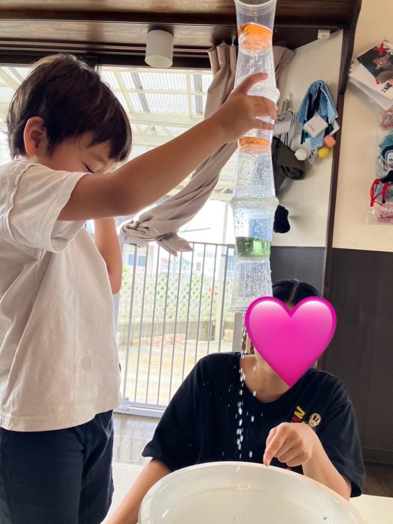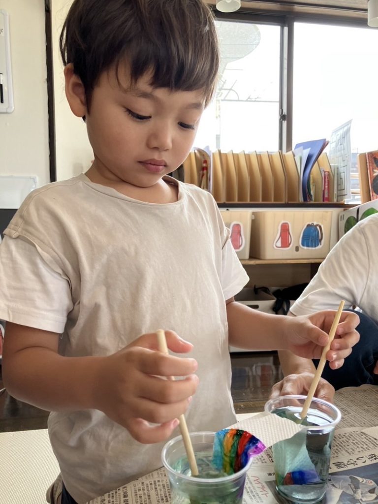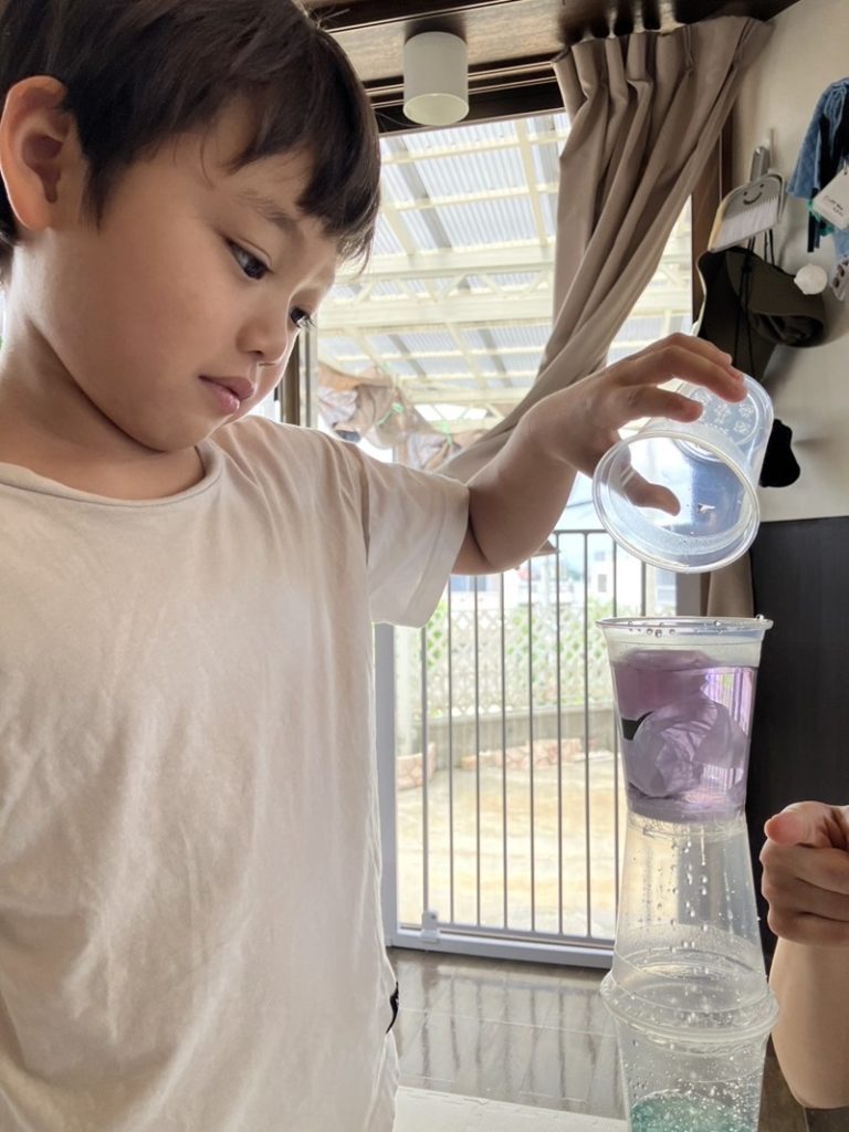 この日は「色水あそび」にチャレンジ!🧪 カップに少しずつ水を注いで、色の変化を楽しんだり キッチンペーパーを使って、色がにじんでいく様子に目を輝かせたり