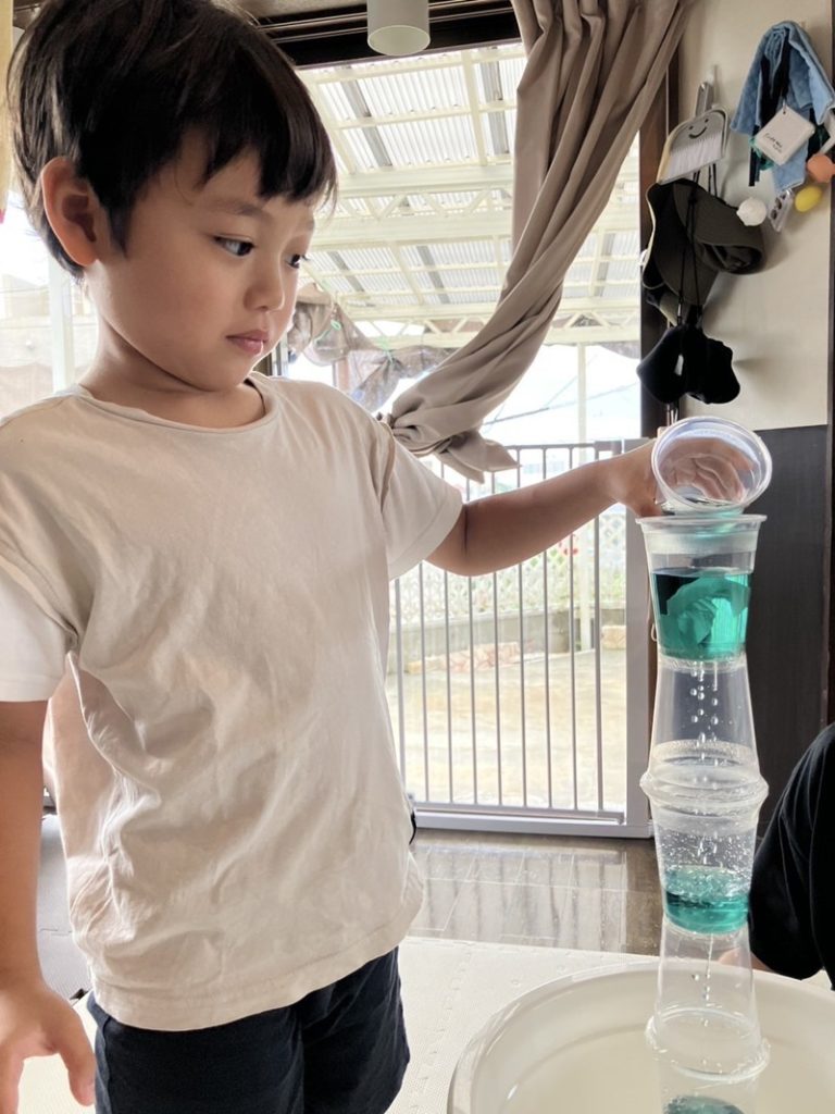透明なコップに、きれいな色水をそっと注いで——じーっと見つめたり、そーっと重ねたり…どの瞬間も、こどもたちのまなざしは真剣そのもの👀✨