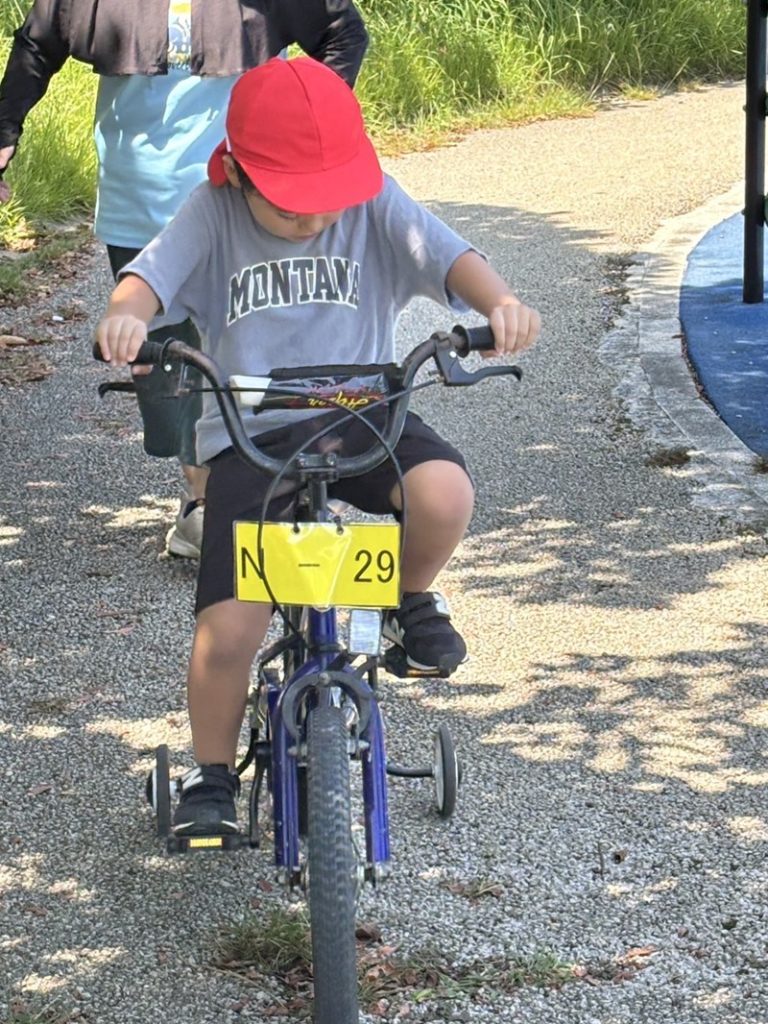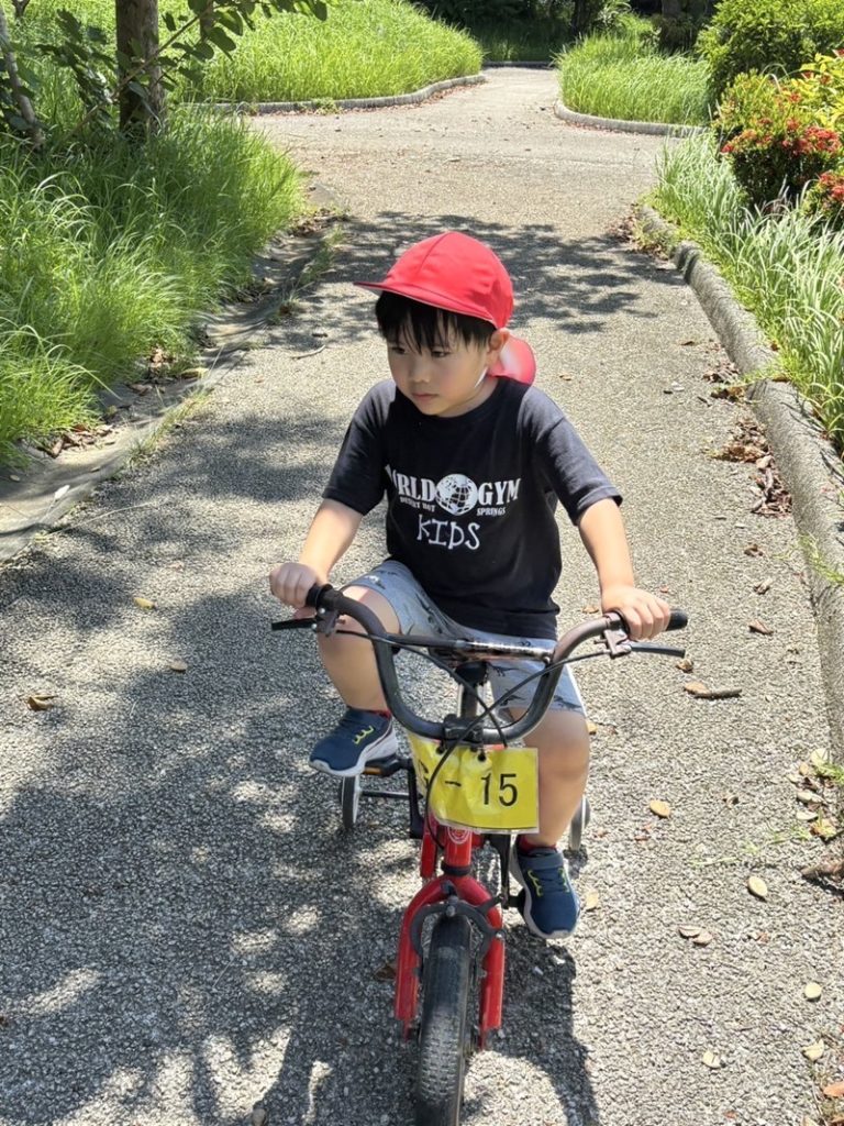「前見て〜!」「ペダル、ぐるぐる〜!」と応援の声に励まされながら、広いコースをぐんぐん前へ✨